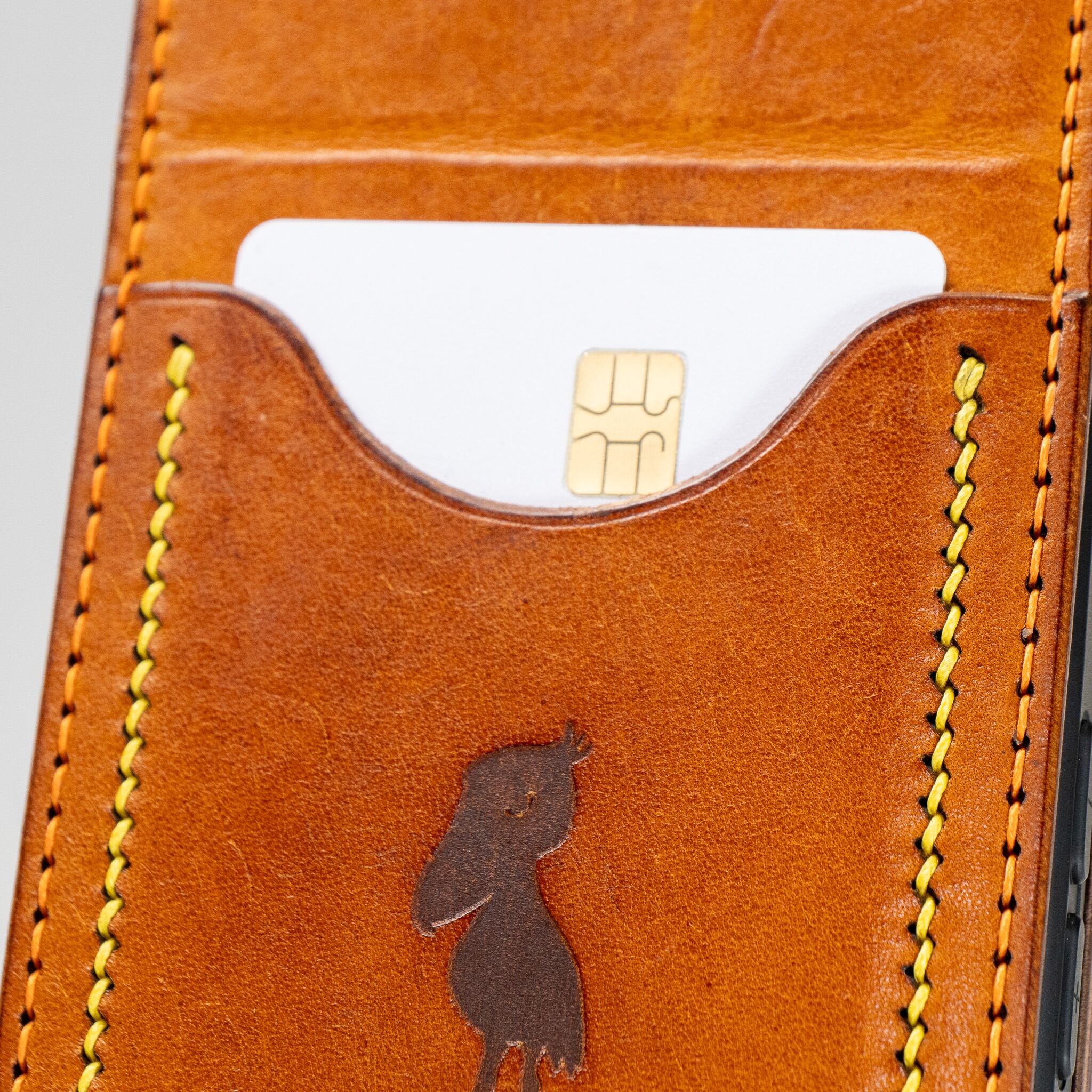 使い勝手が良い縦開き式。フラップのアウターとインナーの両側にそれぞれカード収納があり、こちらはジャストフィットでカードの自然落下の心配はほとんどありません。