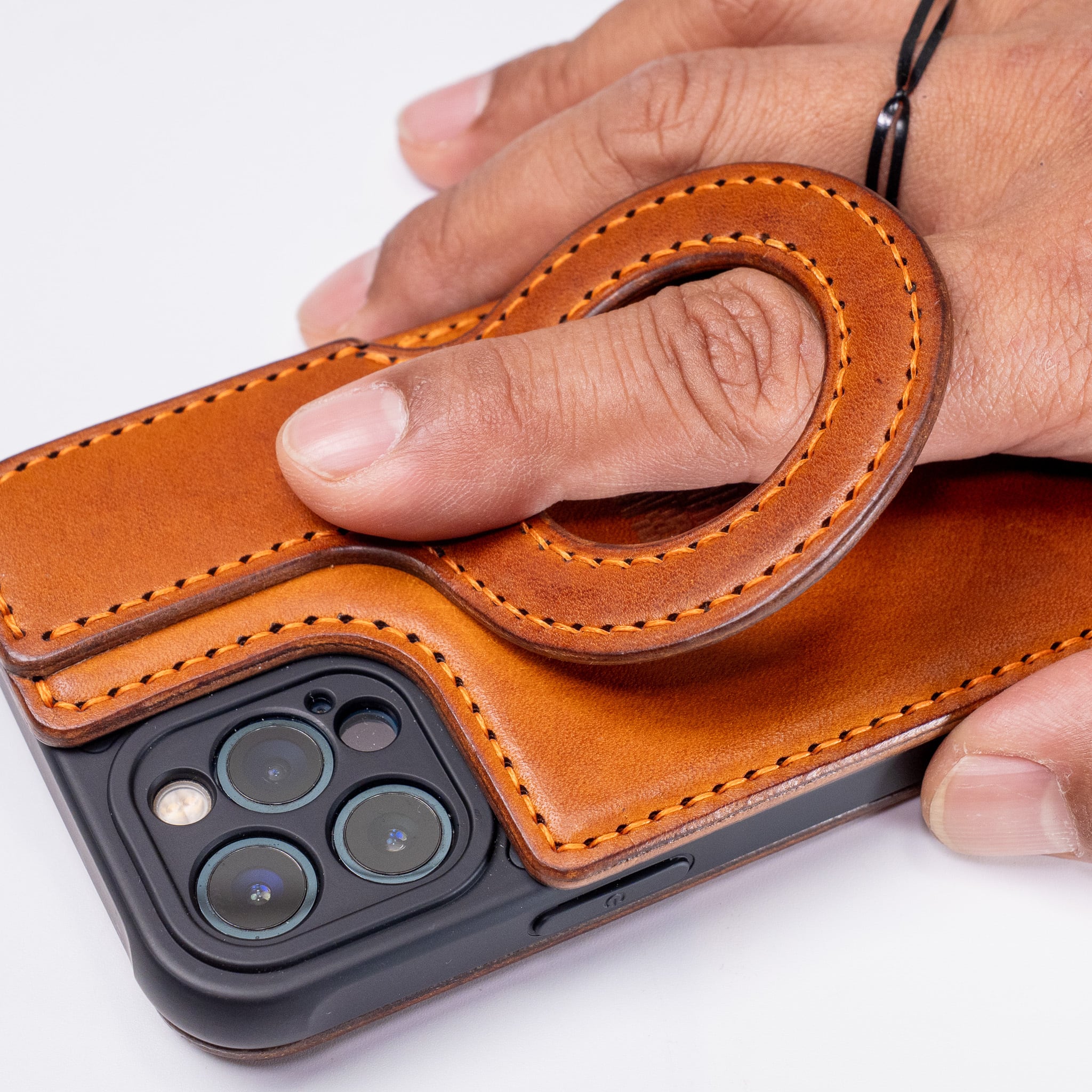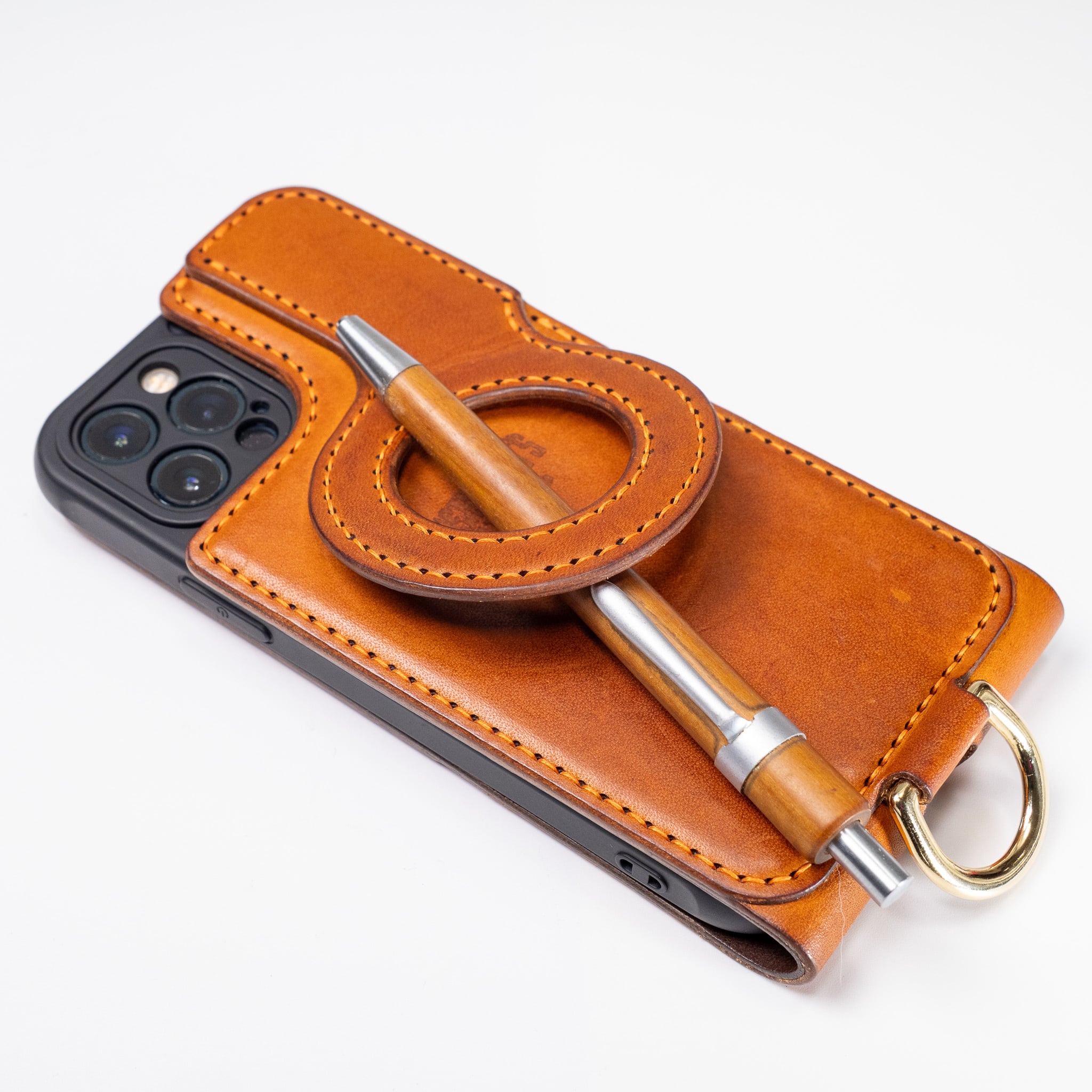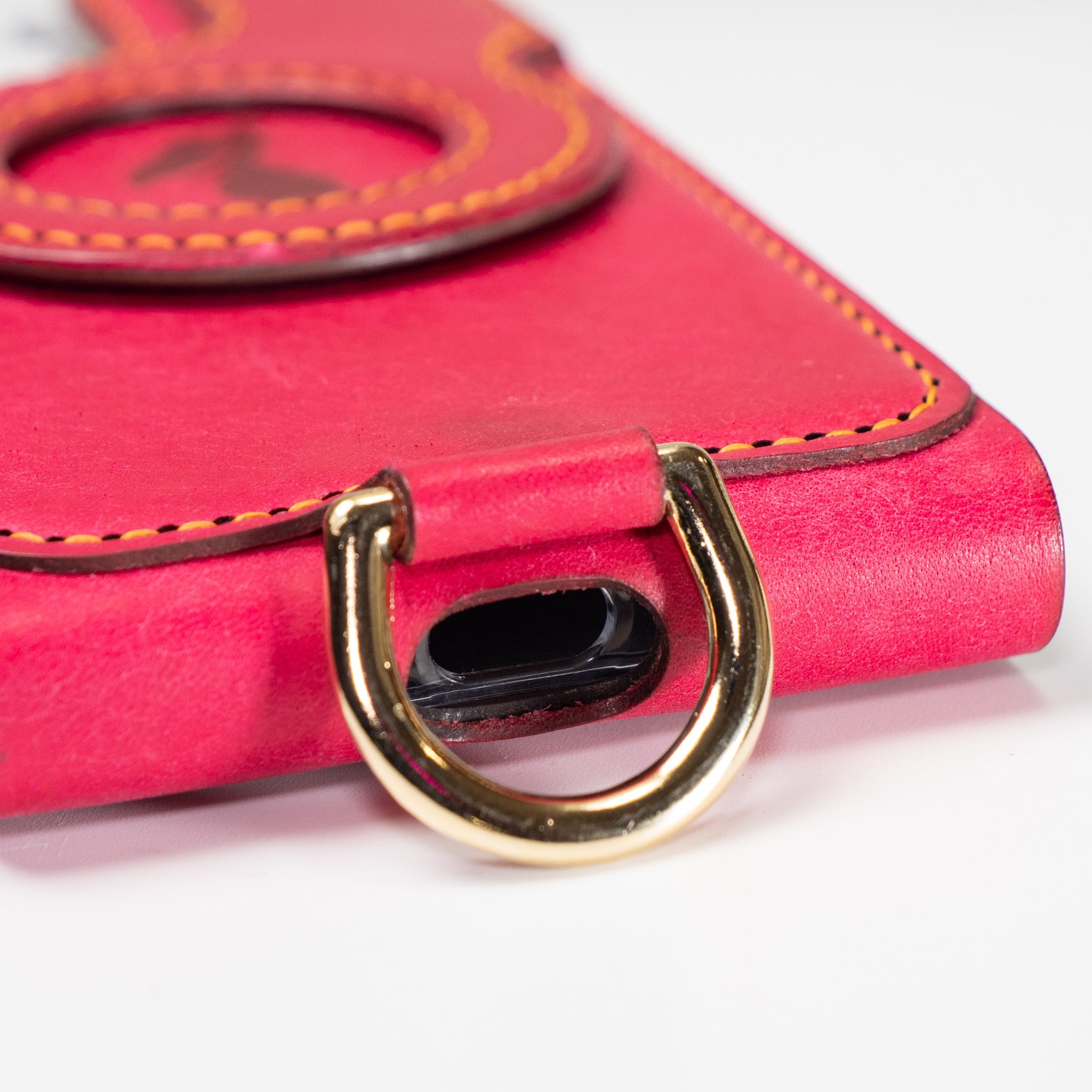 背面に革製の大きなリングを配置。中にはスチールが入っており、しっかり硬いのに、革のおかげで手触りは冷たさや痛さがなく優しい持ち心地です。指を通せば本体をしっかりホールドして安定してスマホを操作することができます。