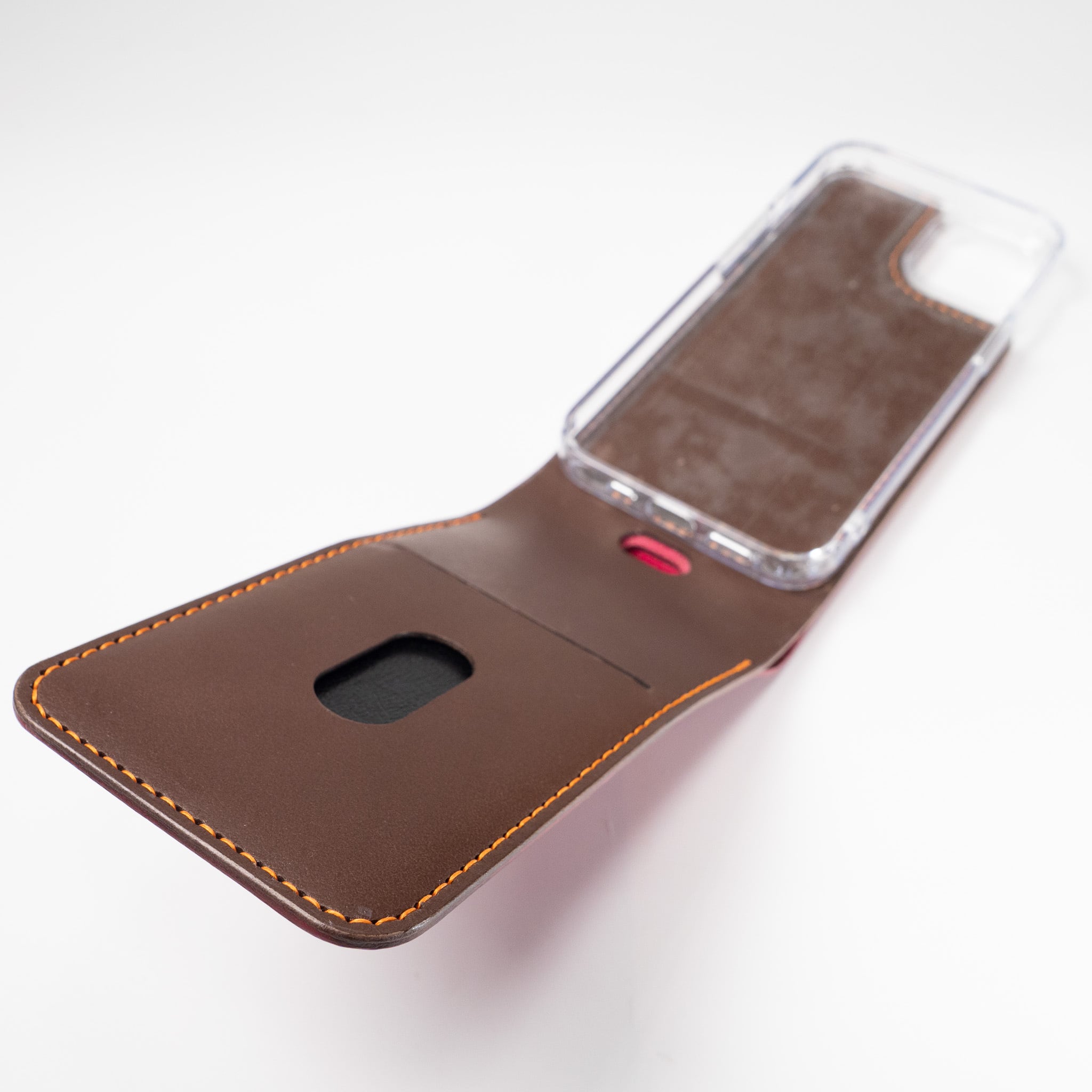 背面に革製の大きなリングを配置。中にはスチールが入っており、しっかり硬いのに、革のおかげで手触りは冷たさや痛さがなく優しい持ち心地です。指を通せば本体をしっかりホールドして安定してスマホを操作することができます。