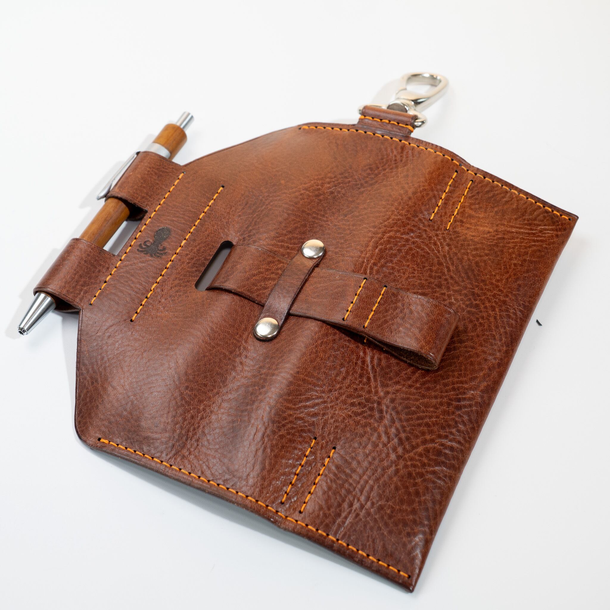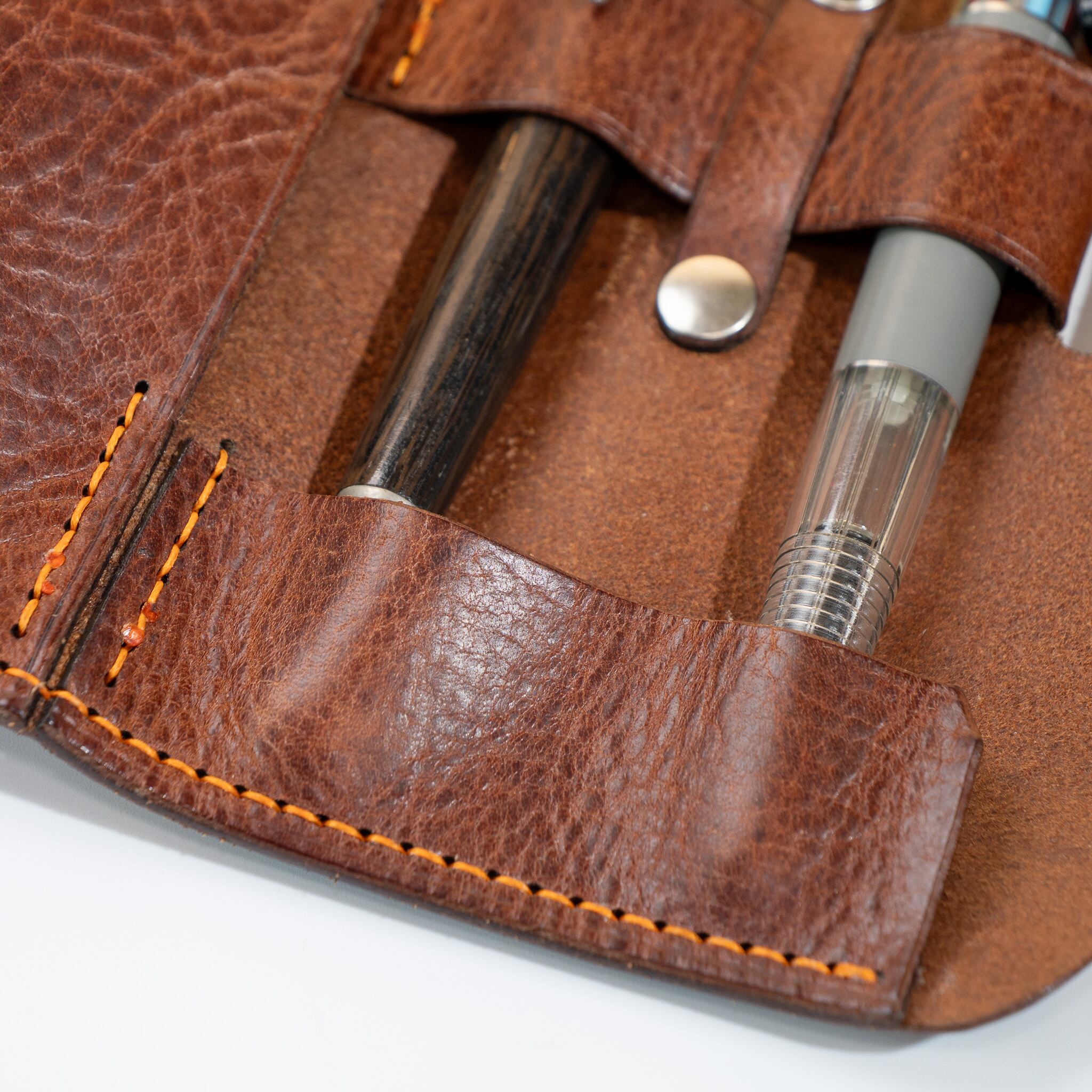 本革だから大事なペンをしっかりホールドしてくれます。さらに外側にさっと取り出せるホルダーをひとつ装備しているので機動性も抜群です。